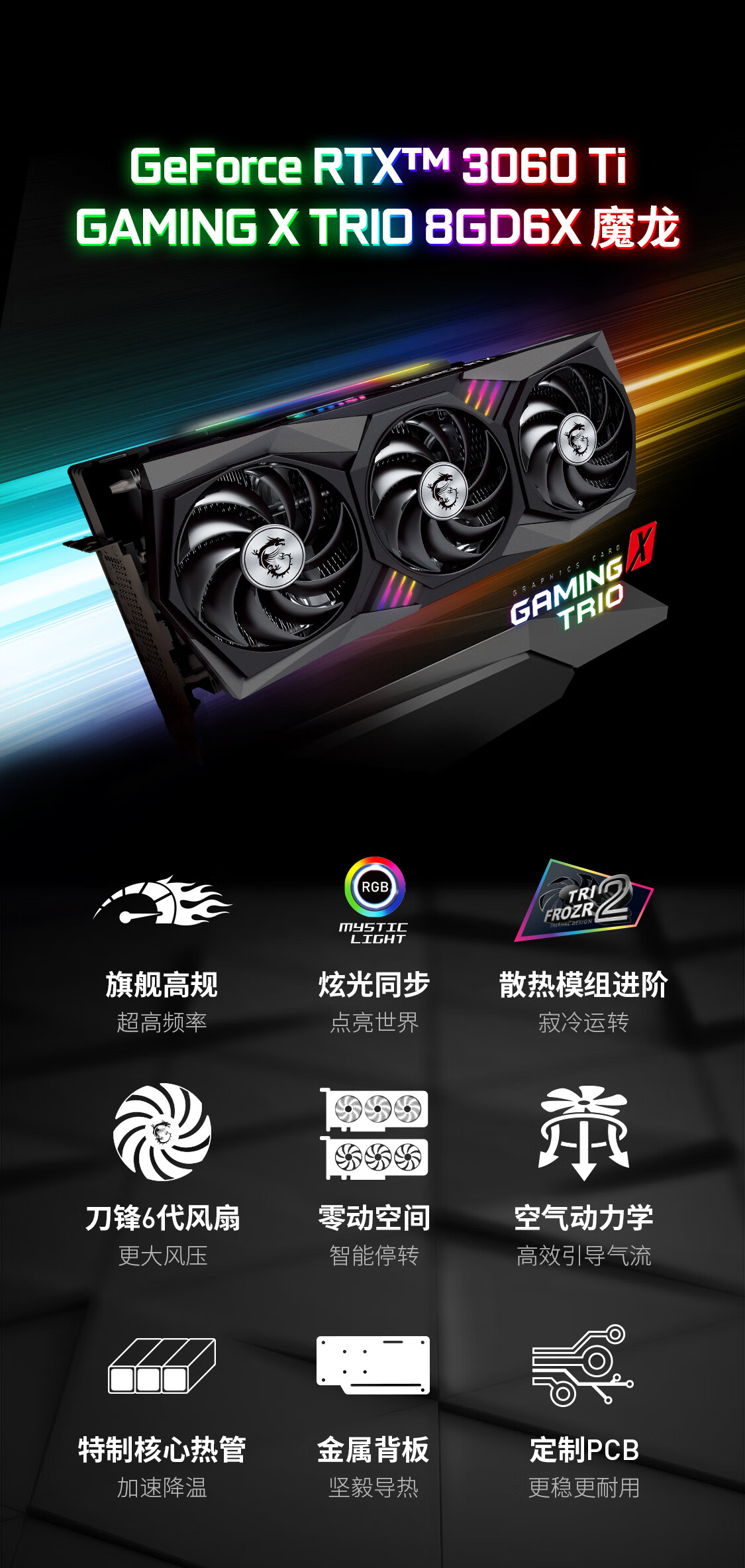 商品名称:微星(MSI)魔龙 GeForce RTX 3060 Ti GAMING X TRIO 8GD6X 超频版 电竞游戏设计专业电脑显卡