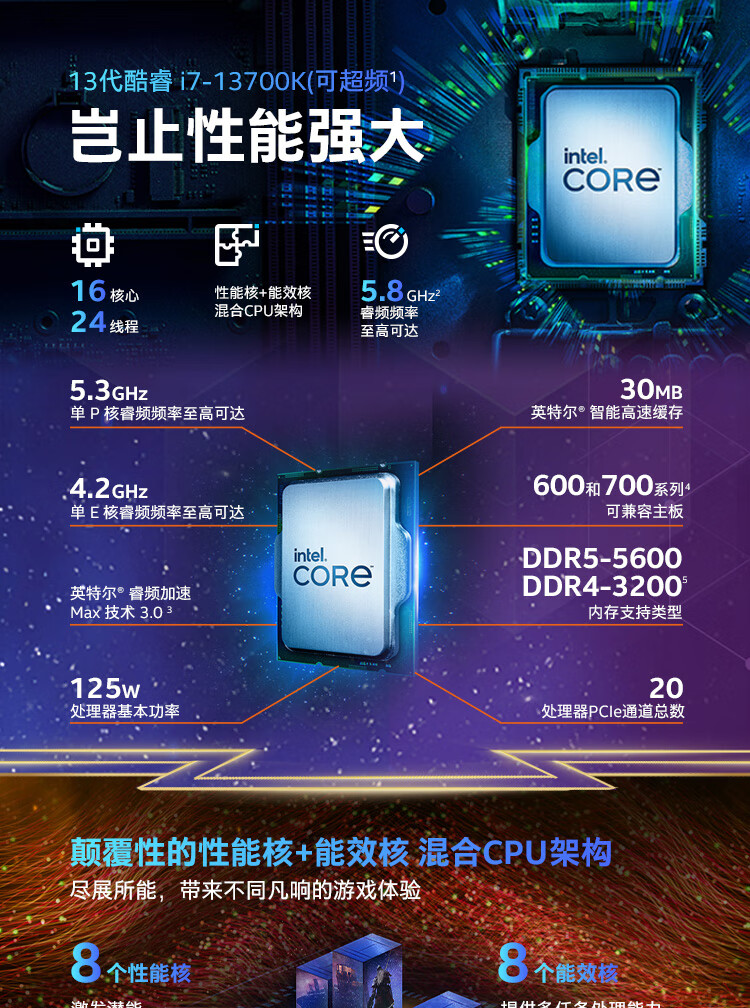 商品名称:英特尔(Intel) i7-13700K 13代 酷睿 处理器 16核24线程 睿频至高可达5.4Ghz 30M三级缓存 台式机CPU