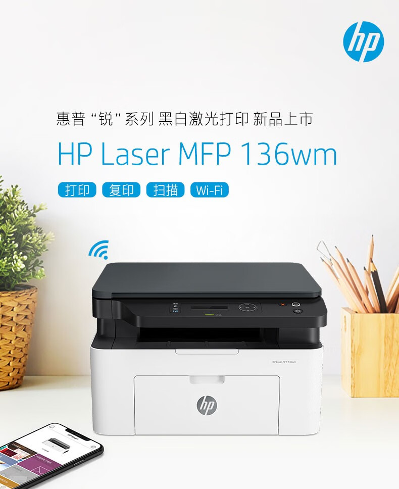商品名称:惠普(HP)打印机 136wm A4黑白激光复印扫描一体机 办公家用 无线 136wm标配