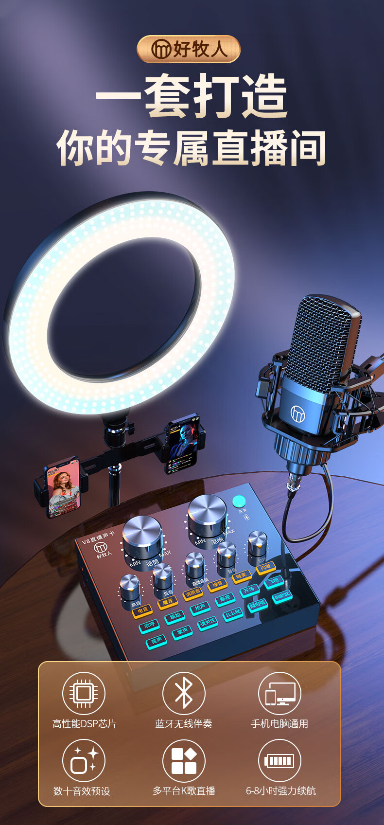 好牧人 V8声卡套装手机直播全民神器麦克风电脑外置户外抖音主播唱歌吧k歌录音直播设备全套话筒电容麦